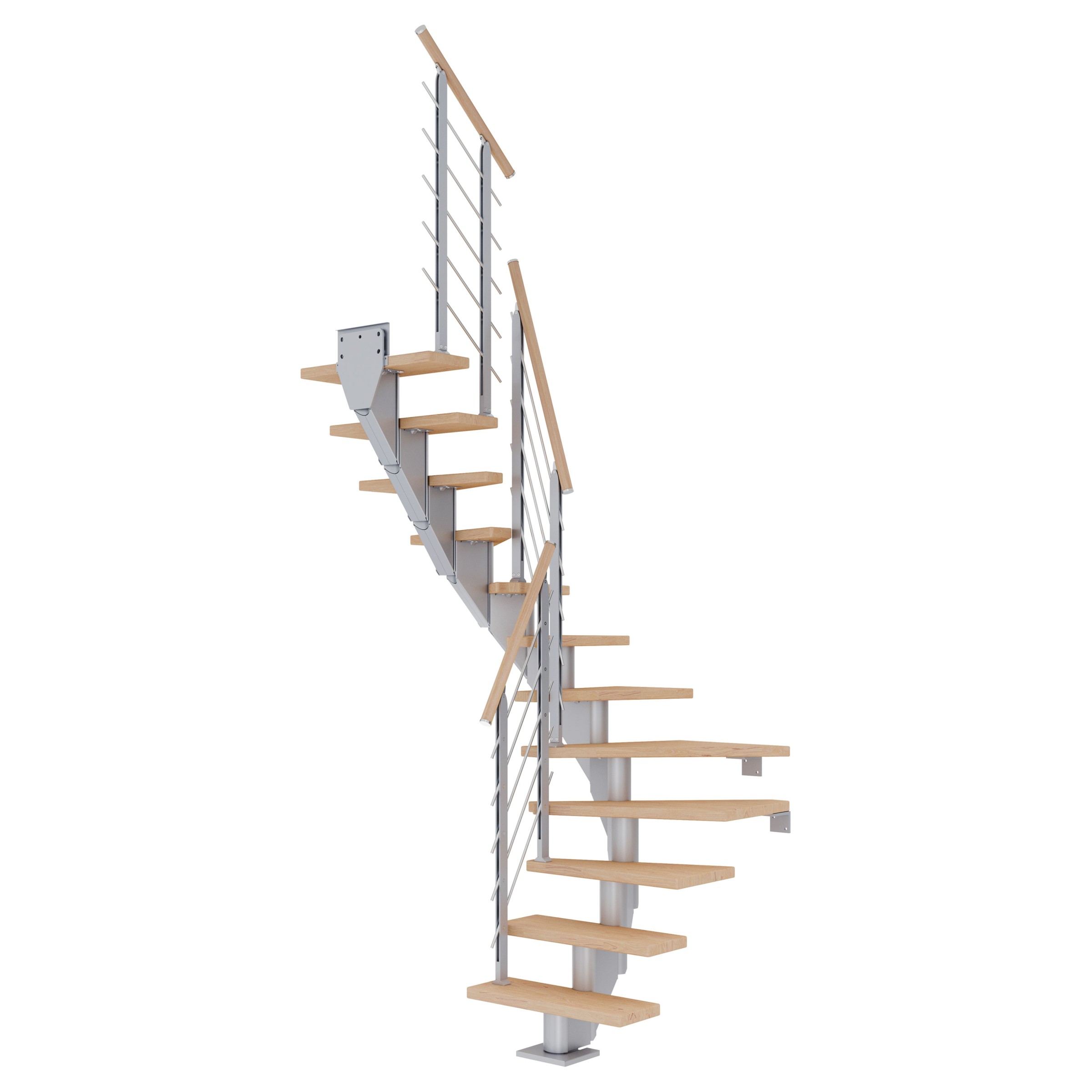 Durch die clevere Modulbauweise eignet sich diese Treppe auch für den Selbsteinbau durch die Bauherrin oder den Bauherrn. Die 11, 12 oder 13 Stufen sind in drei verschiedenen Hölzern erhältlich. Sie haben die Wahl zwischen Buche und Birke in Multiplexholz oder Eiche (Leimholz). Alle Holzvarianten sind lackiert. Das Design aus Metall und geraden Stufen ist modern und funktional und sorgt selbst mit einer Wendelung für einen ruhigen Raumeindruck. Ein Design-Steiggeländer mit Holzhandlauf ist im Lieferumfang enthalten.