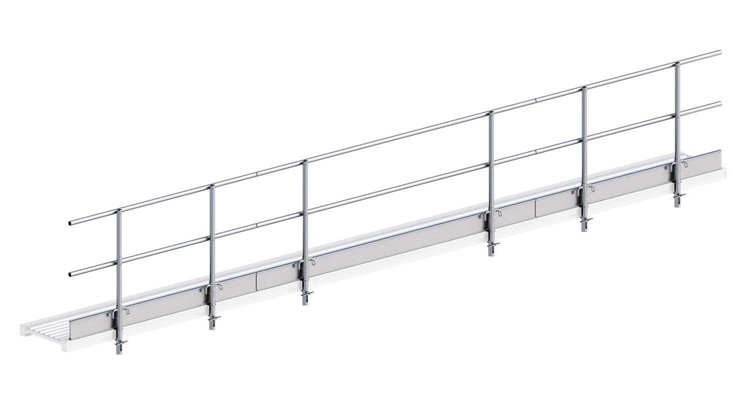 Beim Alu-Steg besteht ebenso die Möglichkeit, abhängig von der Verwendung, einen dreiteiligen Seitenschutz am Alu-Steg zu befestigen.